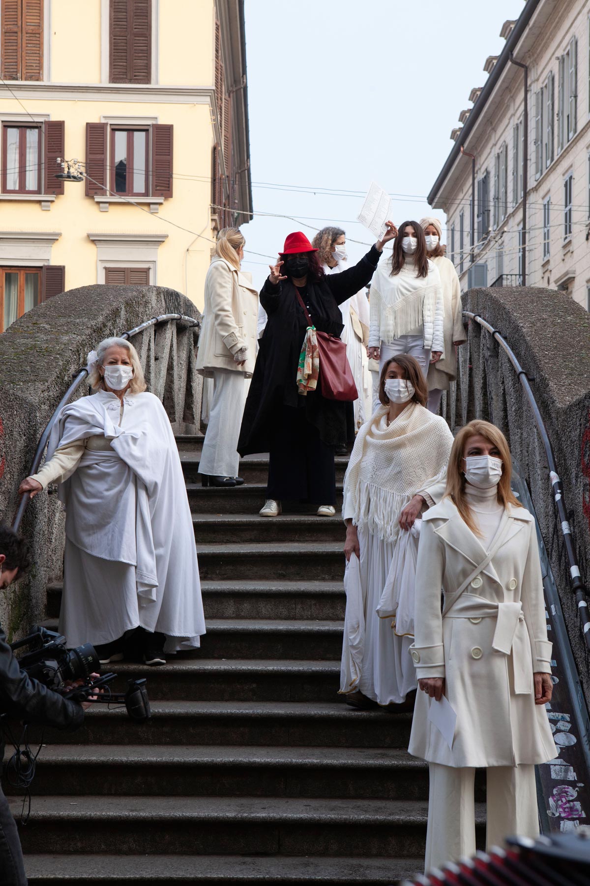 Lungo un percorso simbolico sui Navigli di Milano, che va dal “Ponte Alda Merini” a via Magolfa 32, sede della Casa delle Arti - Spazio Alda Merini, ventun diverse voci di donne (artiste, attrici, ex detenute, cittadine) hanno dato vita a una performance libera e “on the road”, declamando i versi della poesia creata da Andrea Bianconi attraverso 90 titoli di 90 poesie di Alda Merini scelte da Bianconi per celebrare i 90 della poetessa.