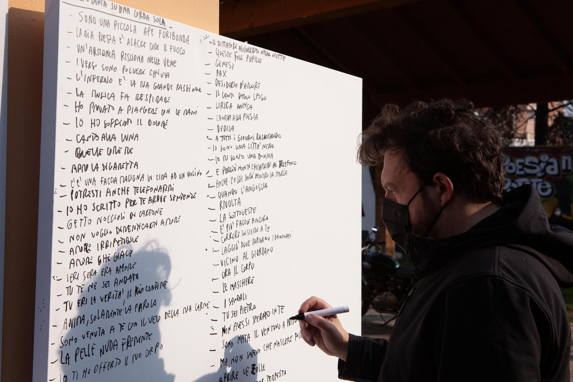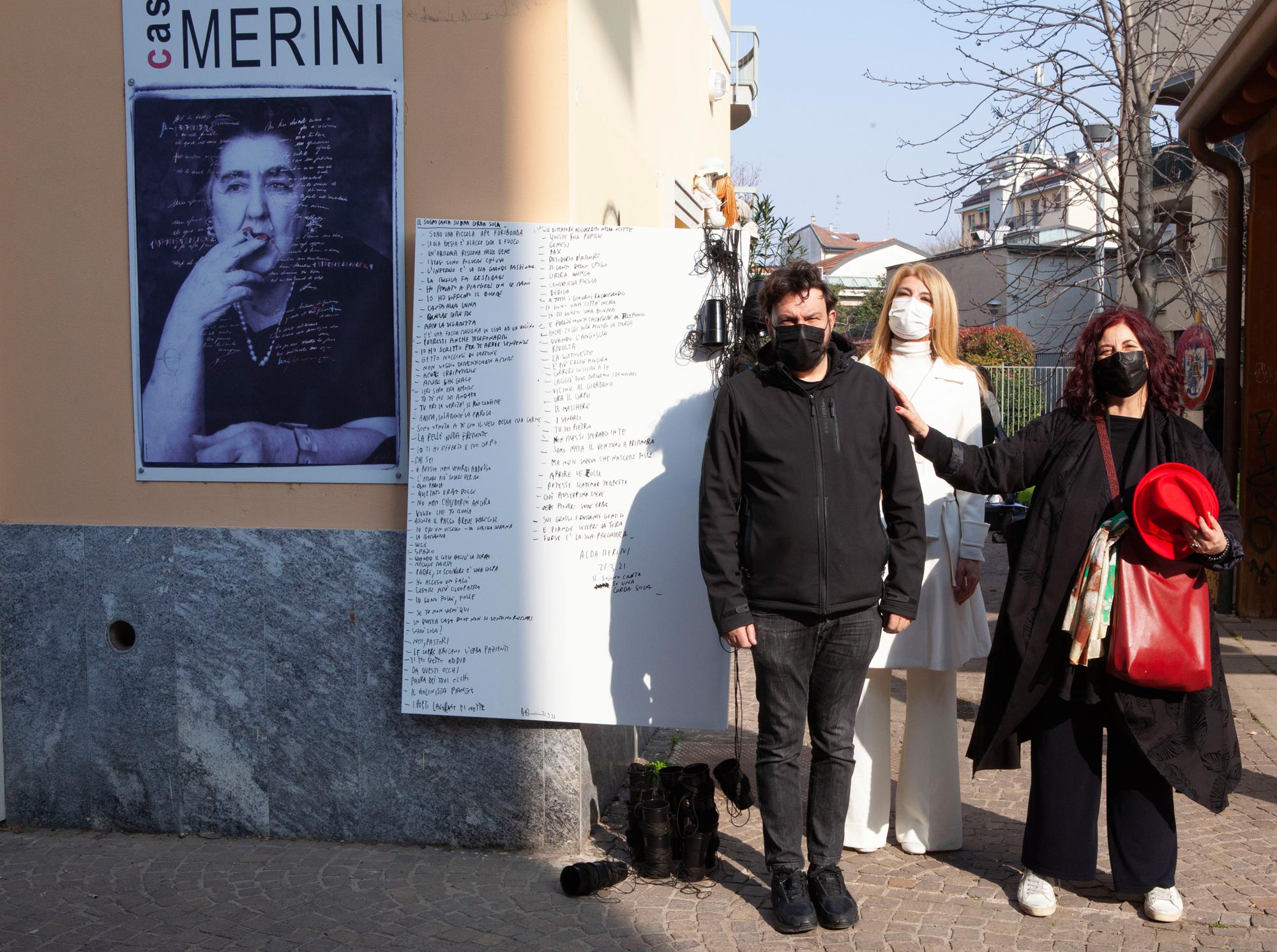 Le parole si sono propagate nello spazio grazie alla ‘corda’ di un lunghissimo telefono senza fili, un’opera site specific ideata da Andrea Bianconi, che ha dato vita a un passaparola di versi unendo donne con vissuti e storie differenti. A raccogliere la corda, davanti alla porta della Casa delle Arti - Spazio Alda Merini, accompagnati dalla fisarmonica del musicista Gianpietro Marazza, sono stati Donatella Massimilla, Gilberta Crispino e Andrea Bianconi. Bianconi, su una grande tela bianca disposta sul muro della Casa delle Arti, ha realizzato un’opera scrivendo a mano i 90 titoli di poesie di Alda Merini: l’opera è stata poi donata dall’artista alla ‘Piccola Ape Furibonda’ per la Casa Museo di Alda Merini.