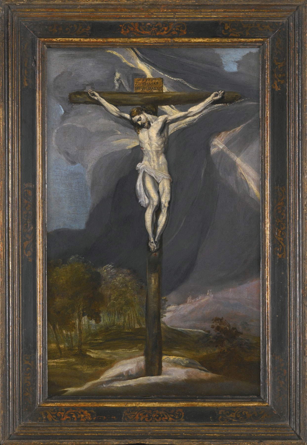 This canvas is distinguished by the Christ on the Cross, which is more set back than that of the other variants, the much larger sky that increases the sense of Jesus’ isolation, and the black cloud that almost seems to swaddle the crucified body. The drama is heightened by the fact that Christ’s arms are higher up than in the other versions. Roberto Longhi, the first scholar to suggest a possible reference for El Greco in Michelangelo’s drawings of the 1540s, also spoke of this Crucifixion. In 2002, Marcin Fabianski proposed instead a comparison with a small sculpture by Giambologna, datable before 1573, a Crucifixion that is preserved in several castings, one of which is in the shrine at Loreto. For the landscape, El Greco seems to have been inspired by works by Titian, in whose studio he almost certainly worked in the early 1570s.