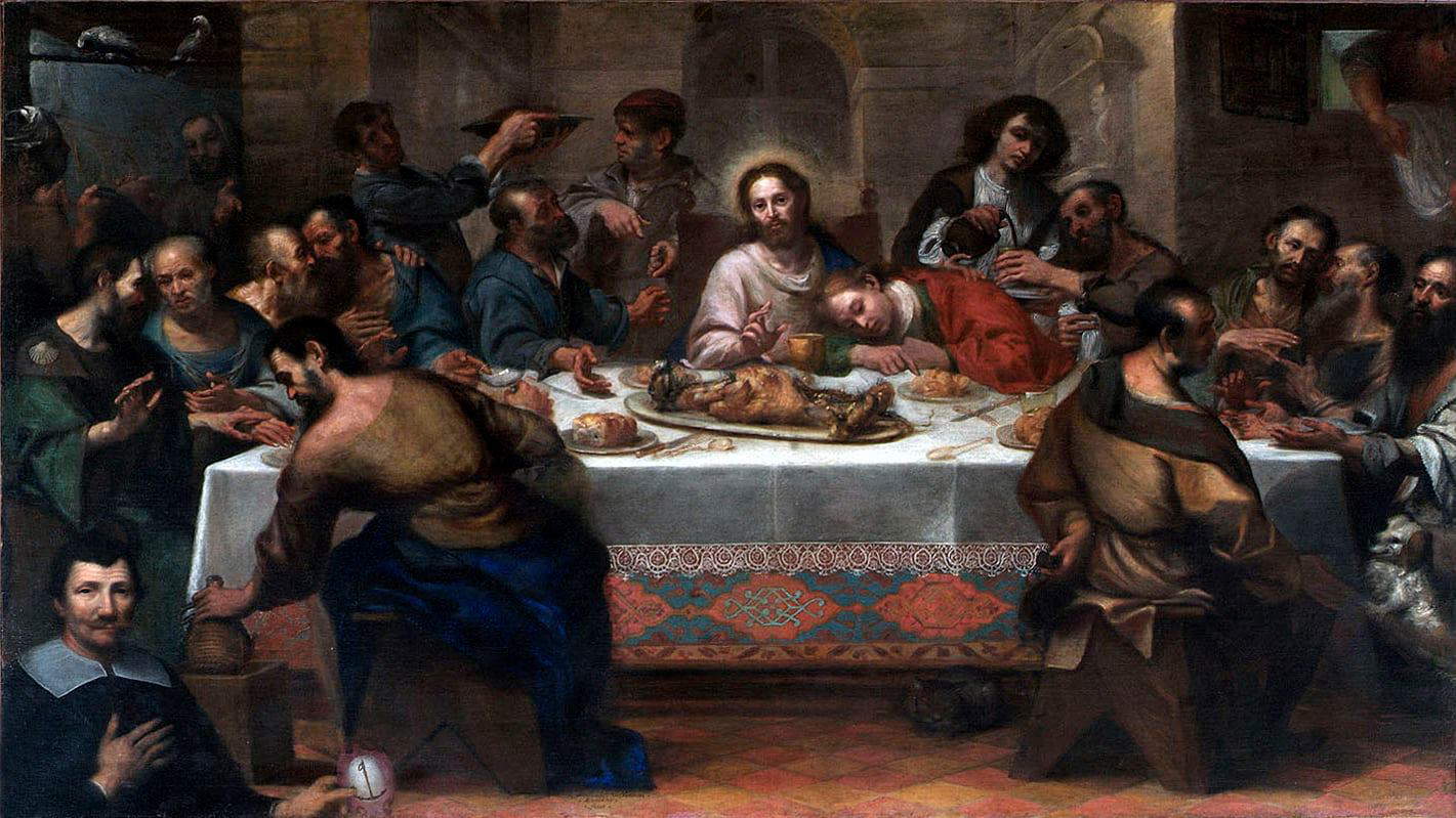 Un dipinto, dunque, dal sapore vintage, si potrebbe dire adoperando un anacronismo: formule, fonti e cromatismi rimandano alle atmosfere della pittura veneziana del Cinquecento. “Lo schema compositivo”, ha scritto lo storico dell’arte Elvio Mich rilevando affinità tra Valdambrini e Girolamo Forabosco, “rinvia […] a modelli ricorrenti nella pittura veneziana del Cinque-Seicento; ma accanto a un generico richiamo alle Cene tintorettesche, è soprattutto l’assunto cromatico che colloca il Valdambrini nel clima pittorico lagunare, all’interno della corrente neocinquecentesca”. Il colore di Ferdinando Valdambrini, steso con pennellate pastose a definire le forme senza il ricorso al disegno, e declinato secondo una “media scala cromatica d’intonazione madreperla e con poche note brillanti di rosso, di verde e d’azzurro”, tocca una qualità “di assoluta rilevanza”, sottolinea Mich. Il tutto è però reso moderno dal realismo vivo dei brani di natura morta, e da quello crudo, quasi grottesco dei personaggi, popolani dalle mani tozze di chi è abituato ai lavori pesanti, i cui volti tondi e larghi son solcati da rughe profonde e invecchiati dalla fatica. Anche Gesù, presago di quel che gli accadrà, fissa i suoi occhi in quelli del riguardante con un’espressione stanca che gli attraversa il viso ossuto e provato. Moderno è poi il ricordo romano della lama di luce che entra dalla finestra nell’angolo di sinistra, illumina le due colombe appollaiate sul reggitenda, investe il turbante dell’inserviente che sta subito sotto di loro, e finisce per perdersi nella luce diffusa del locale, un’aula ampia, pavimentata in cotto, con nicchie alle pareti e finestrelle. Da quella di destra, ulteriore brano di quotidianità, s’affaccia pure una donna che scuote un panno.