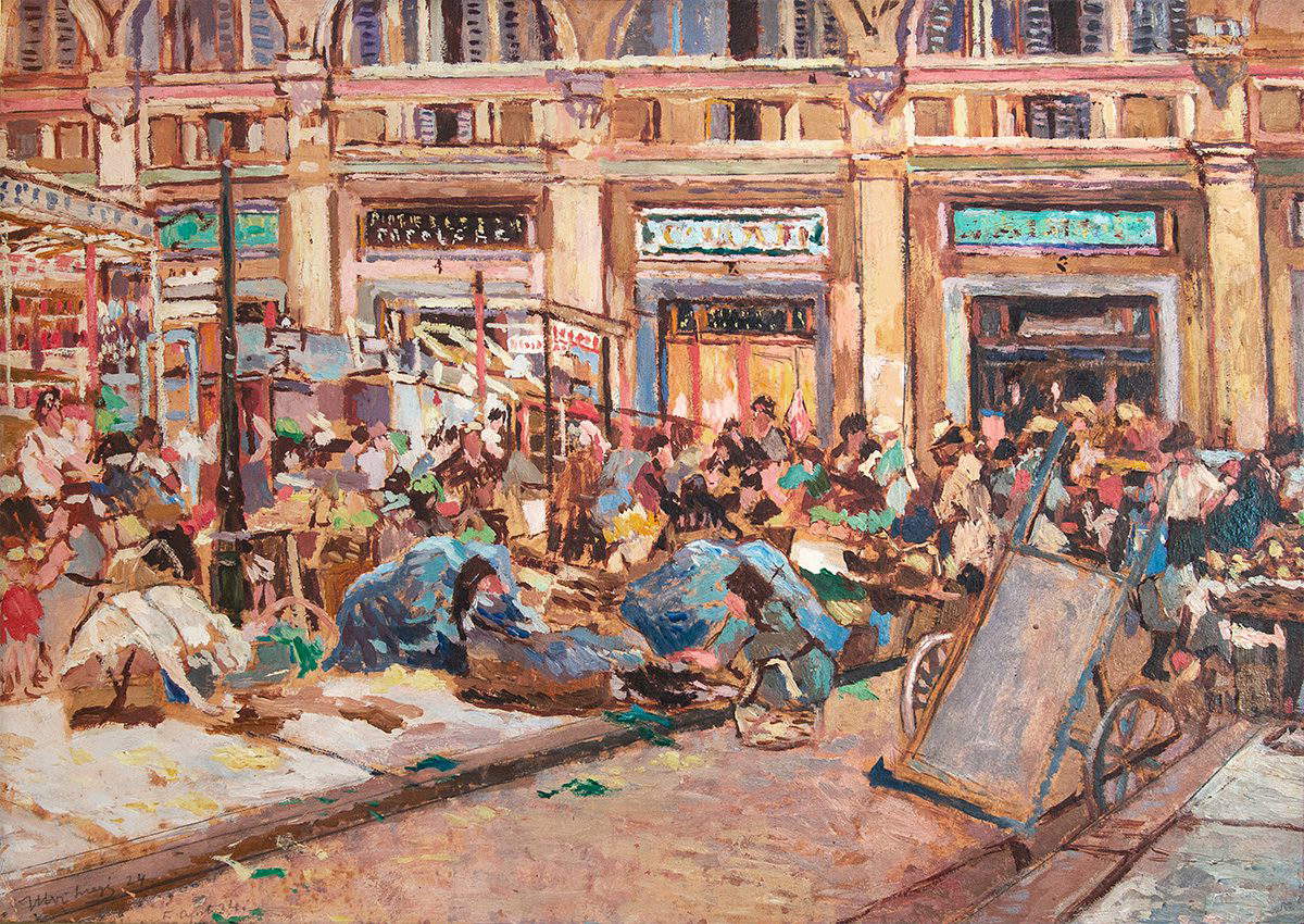| Ulvi Liegi, Il Mercato centrale (1924; olio su cartone, 35x49,5 cm; Livorno, Museo Civico Giovanni Fattori)