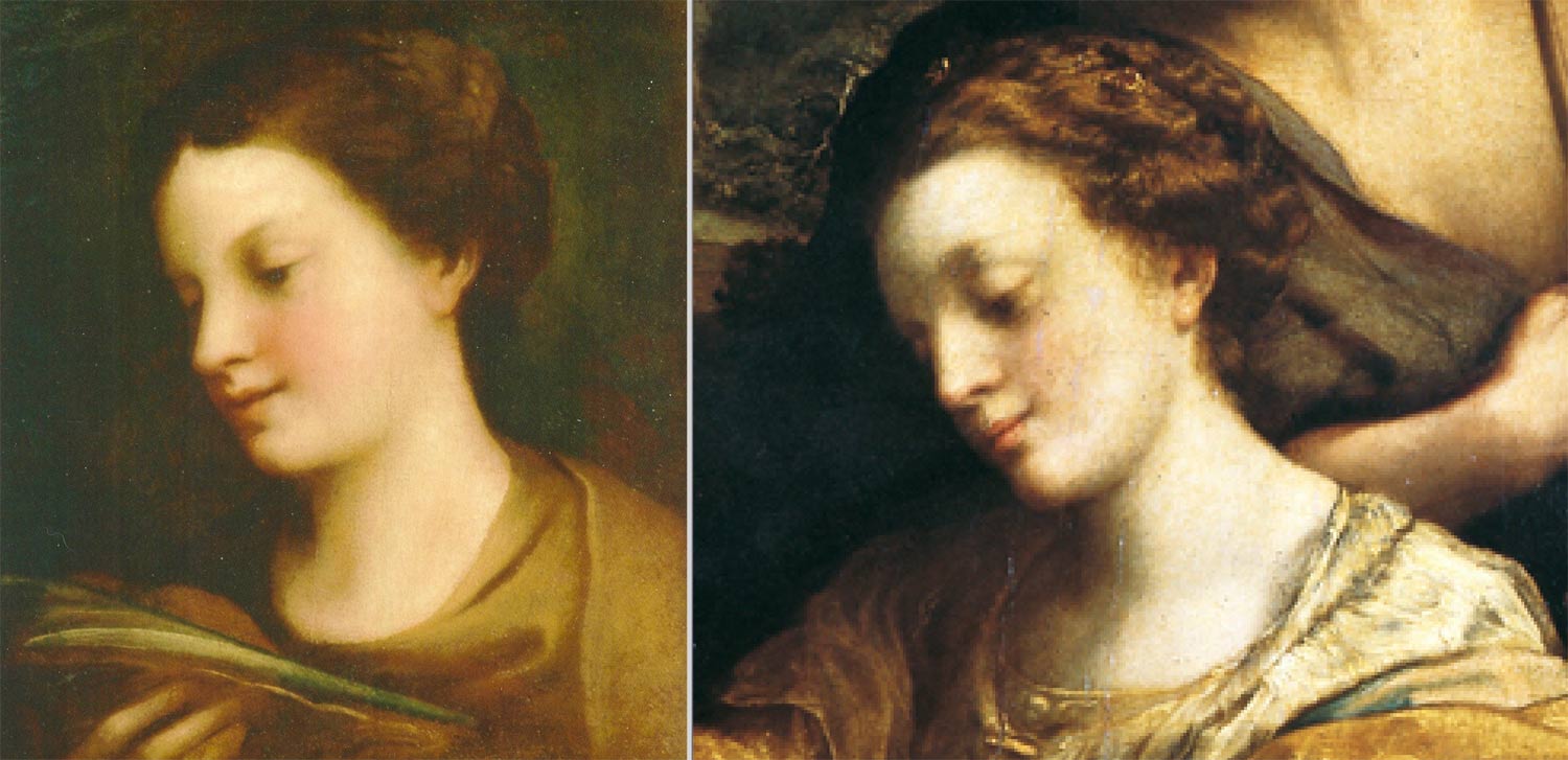 | 16. Un confronto. Il volto della Sant’Agata e quello della Santa Caterina del Louvre. La simiglianza è toccabile. Il rilievo grafico dei due profili è perfettamente identico, sovrapponibile. Di grande importanza è il vedere come la Sant’Agata sia stata eseguita frescamente davanti alla modella, mentre la Santa Caterina è professionalmente più elaborata e finita. |