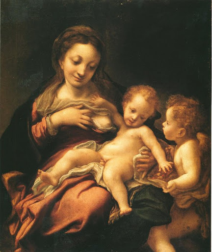 | 9. Correggio, Madonna col Bambino e San Giovannino (olio su tela, 64 x 50 cm; Chicago. The Art Institute). Vediamo qui la tipologia del volto femminile del Correggio come il pittore usa nella su prima fase, che comprende anche le pale della Madonna di San Francesco e della Madonna di Albinea. Si tratta di volti appena allungati dai fini lineamenti, con le labbra sottili, il naso affilato e le arcate sopracciliari aperte e nitide. |