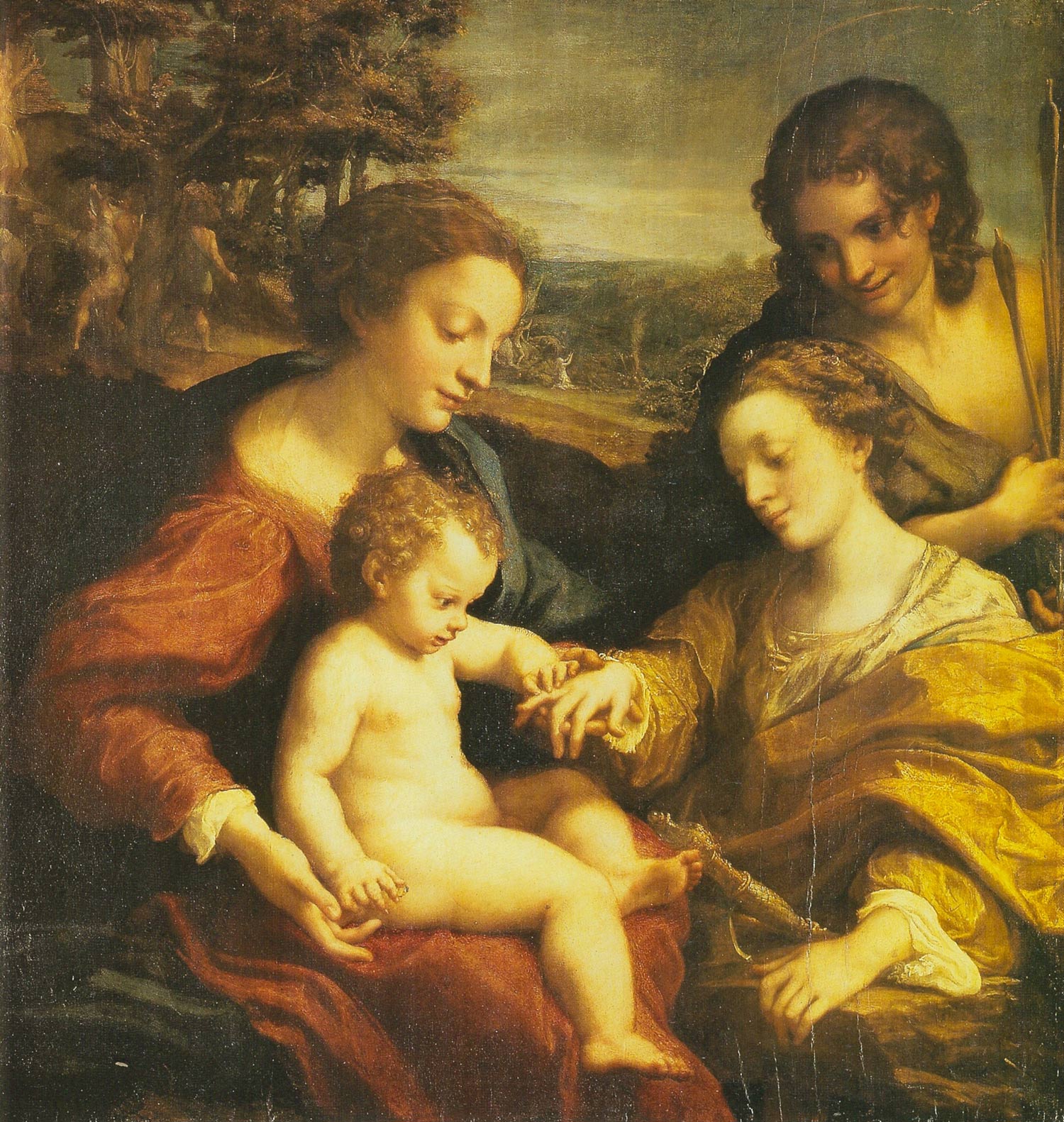 | 15. Correggio, Matrimonio mistico di Santa Caterina con figura di San Sebastiano (olio su tavola, 105 x 102 cm; Parigi, Museo del Louvre). È il capolavoro che ha suscitato lo stupore del Vasari. Le due figure femminili nei loro volti appaiono come sorelle e riprendono il tipo femminile che ben conosciamo. Questa tavola che fu probabilmente un dono familiare del Correggio all’amico Francesco Grillenzoni, raccoglie tutta l’acclarata maestria dell’artista ma pure tutta l’intimità del suo animo. Il nucleo sostanziale del dipinto non risiede soltanto nell’intreccio delle mani ma particolarmente nell’intensità con la quale gli occhi si concentrano sull’avvenimento sponsale. Potremmo definire questa visione, alla quale partecipiamo così da vicino, come un’alta dolcitudine spirituale senza parole umane. |