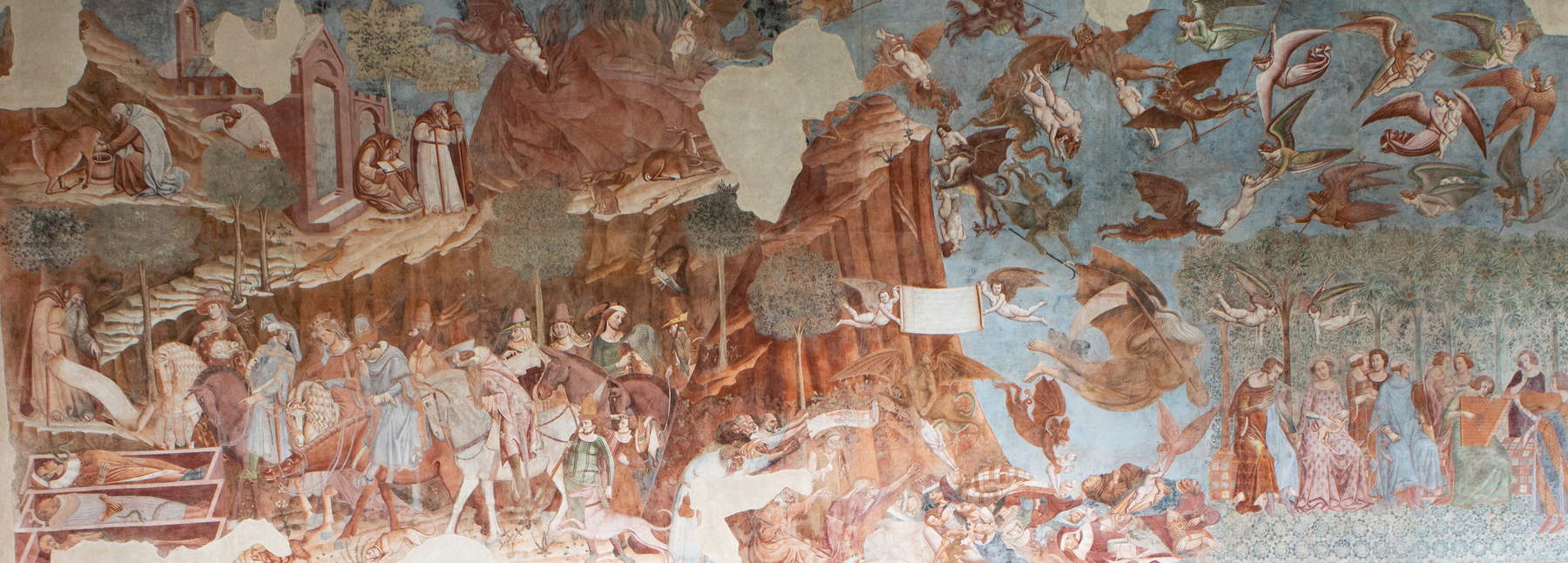 In un’altra porzione di affresco si vede la Morte, la grande falciatrice, che miete i suoi poderi di questo mondo. Trascura i poveri, i malati, gli afflitti che pure la invocano come rimedio ai loro mali, mentre si accanisce sui potenti di questo mondo: papi, re, vescovi, giudici, notabili di vario genere. Di tutti costoro, uniti dalla falce della Morte, i demoni e gli angeli (ecco un altro contrasto) si disputano le anime.