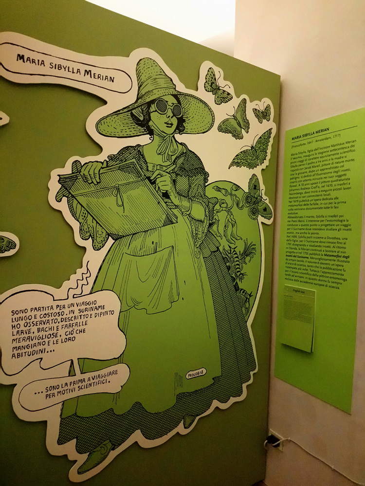 Oltre ad essere infatti una mostra ben studiata e comprensibile, con la presenza di chiari pannelli espositivi, ne risulta particolarmente piacevole l’allestimento e quindi l’intera visita: ogni sezione è colorata e illustrata dal noto fumettista Paolo Bacilieri con figure a grandezza d’uomo dei singoli viaggiatori che accompagnano i visitatori attraverso il percorso espositivo.